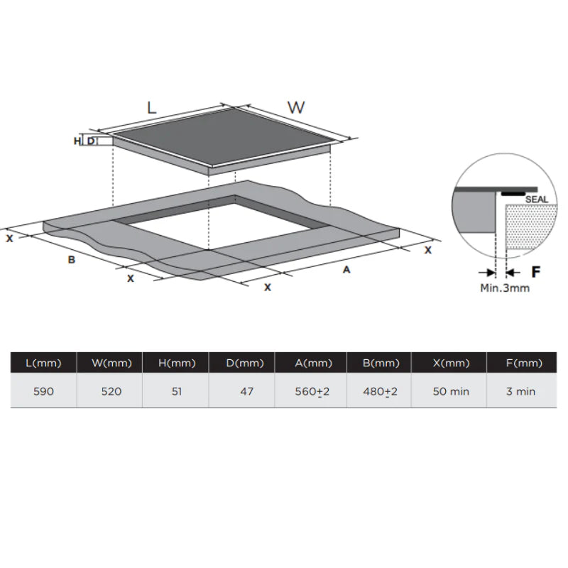 Touch control, individual timer, automatic safety switch off, residual heat indicator, 9 stage power setting, child lock, dual ring, cut-out size W x D (mm): 560 x 480, appliance size W x D (mm): 590 x 520, 36 month warranty