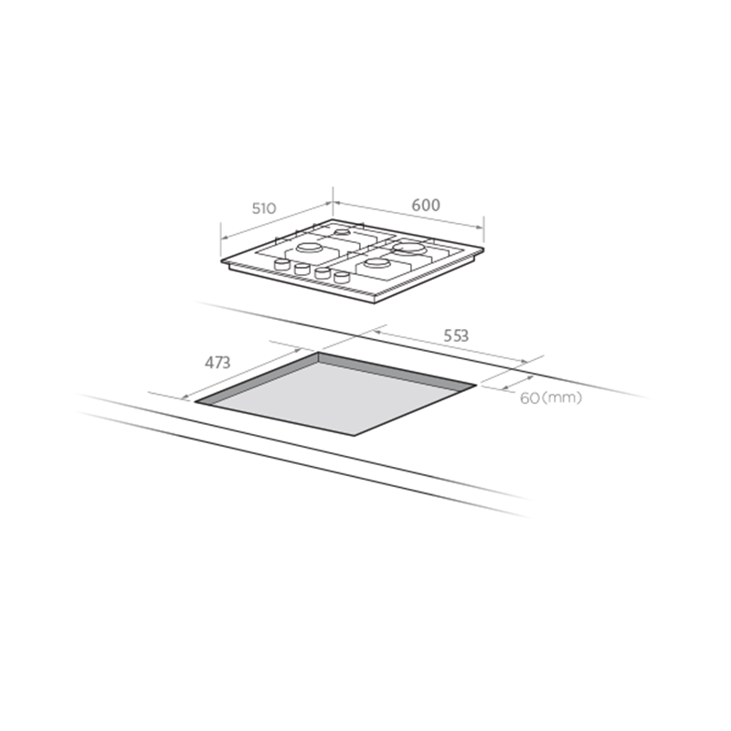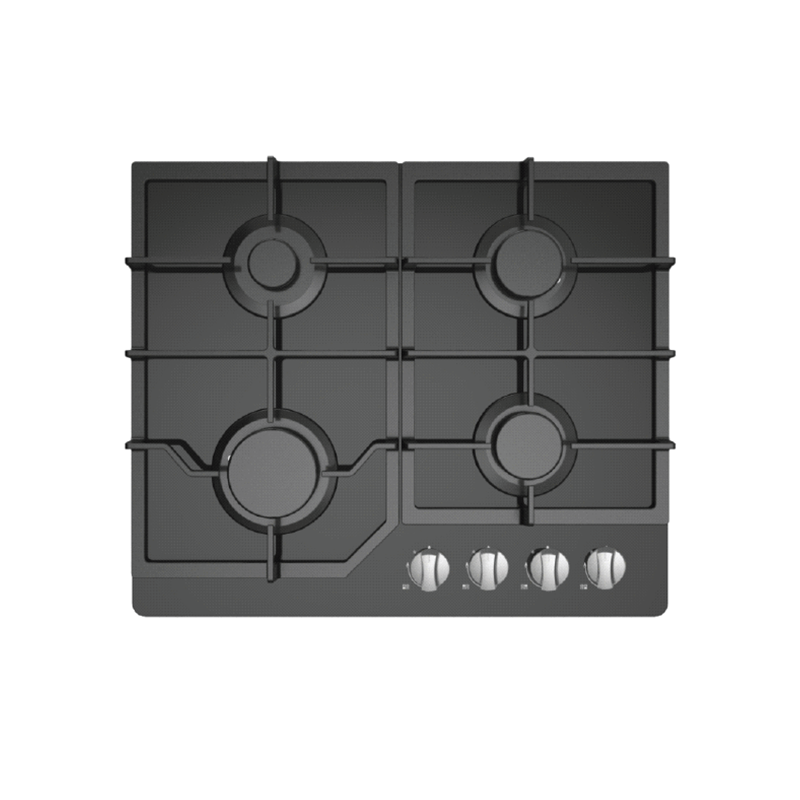 4 burners, Sabaf burners, NG, LPG, Glass cooktop, Automatic ignition, Cast iron pan supports, Flame failure devices, 1 Rapid burner: 3.6 kW (13MJ), 2 Semi-rapid burners: 1.75 kW (6.3MJ), 1 Auxiliary burner: 1.0 kW (3.6MJ), Regulator and test point, Product dimension (WxD) (mm): 600x510, Cut Out (WxD) (mm) 560x480. Warranty: 24 months