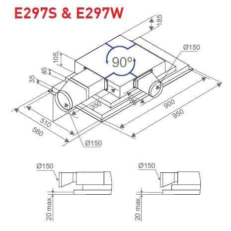 4 Speeds 1000m3/hr Maximum extraction Very low noise with internal ECO motor Clean-Air Function Perimeter Aspiration LED Lights Requires 150mm ducting Motor outlet may be configured for side or end exit Low profile to suit shallow ceiling cavities or bulkheads Remote control (optional wired wall control available as an accessory)