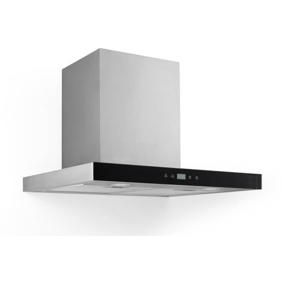 Smart stainless steel box canopy with black glass touch control panel including clock and variable 3 speed control with timer function, LED lights, air movement of 1000m³, removable easy clean aluminium filters, ducting outlet of 150mm and can be recirculated.