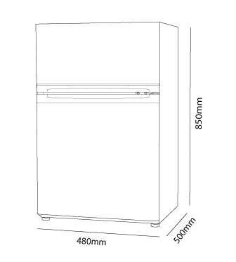 Mechanical temperature control, internal light in fridge only, reversible door, manual defrost, adjustable front feet, 61L fridge capacity, 24L freezer capacity, 2.5 star energy rating, appliance size W x D x H (mm): 480 x 500 x 850, 7 year warranty