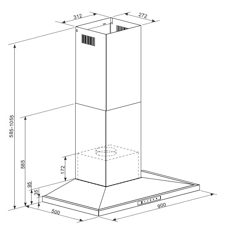 Silent series motor, 3 fan speeds, 44 dB(A) operating noise, illuminated soft touch controls, stainless dishwasher safe baffle filters, LED lights, timer, appliance size W x D x H (mm): 900 x 500 x 585-1055, 24 months warranty